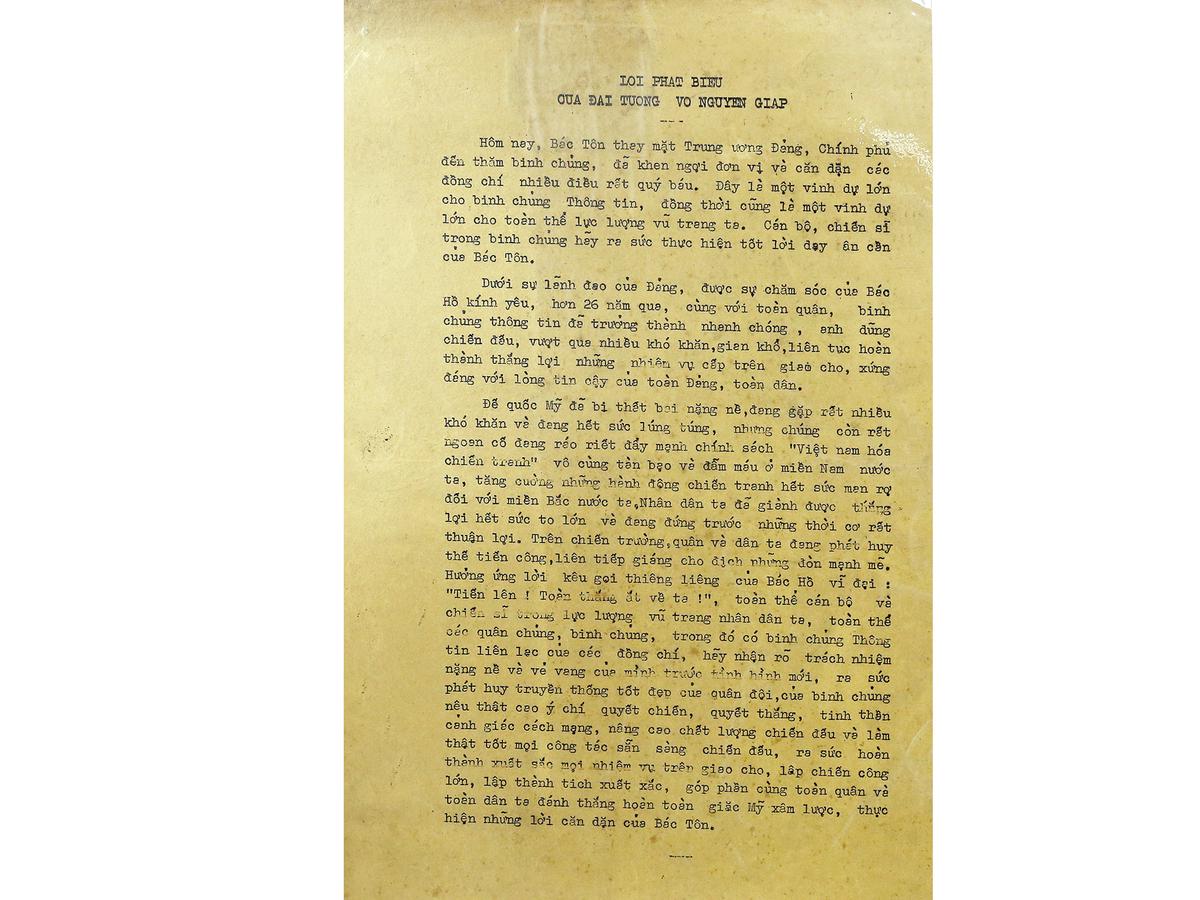 Đại tướng đã đánh giá, khen ngợi Bộ đội Thông tin liên lạc xứng đáng với lòng tin cậy của toàn Đảng, toàn dân đồng thời chỉ ra nhiệm vụ hết sức nặng nề của toàn quân nói chung và Bộ đội Thông tin liên lạc nói riêng. Đại tướng đã động viên, khích lệ Bộ đội Thông tin liên lạc phát huy truyền thống tốt đẹp của Bộ đội cụ Hồ, người Chiến sĩ Thông tin ưu tú của Binh chủng, nêu cao ý chí quyết chiến quyết thắng làm thật tốt công tác bảo đảm thông tin liên lạc góp phần cùng toàn quân đánh thắng giặc Mỹ xâm lược.
