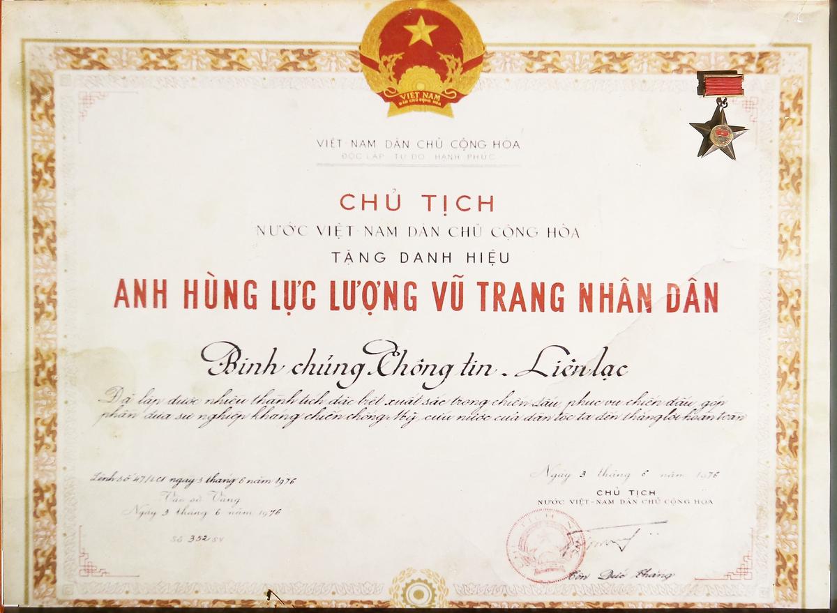 Với những thành tích đã đạt được, ngày 03/6/1976, Chủ tịch nước Việt Nam Dân chủ cộng hòa Tôn Đức Thắng đã ký Lệnh số 47/CCT, vào sổ Vàng 352/SV tặng Danh hiệu Anh hùng lực lượng vũ trang nhân dân cho Binh chủng Thông tin liên lạc.