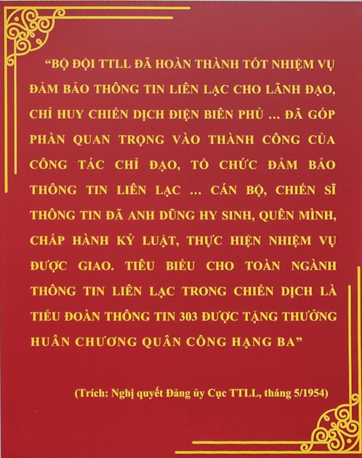 Bộ đội TTLL đã hoàn thành tốt nhiệm vụ đảm bảo thông tin liên lạc cho lãnh đạo, chỉ huy Chiến dịch Điện Biên Phủ…đã góp phần quan trọng vào thành công của công tác chỉ đạo, tổ chức đảm bảo thông tin liên lạc…cán bộ, chiến sĩ thông tin đã anh dũng hy sinh, quên mình, chấp hành kỷ luật, thực hiện nhiệm vụ được giao. Tiêu biểu cho toàn ngành thông tin liên lạc trong chiến dịch là Tiểu đoàn Thông tin 303 được tặng thưởng Huân chương Quân công hạng Ba”.