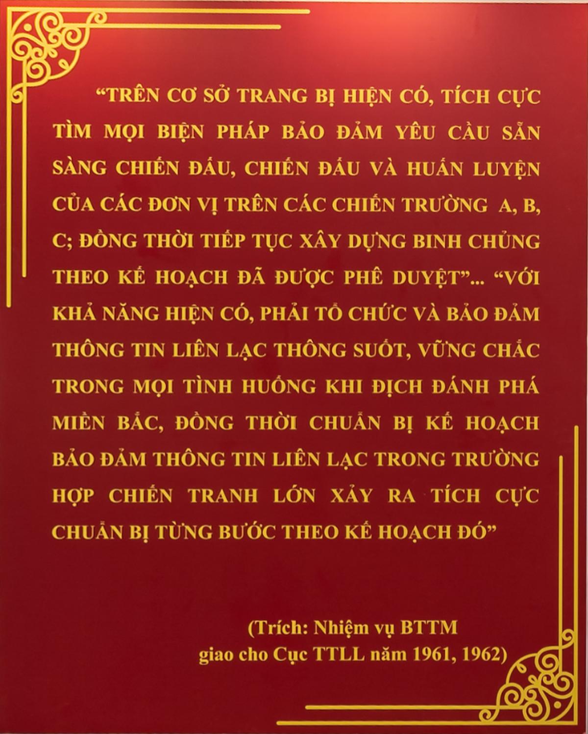"Trên cơ sở trang bị hiện có, tích cực tìm mọi biện pháp bảo đảm yêu cầu sẵn sàng chiến đấu và huấn luyện của các đơn vị trên các chiến trường A, B, C; đồng thời tiếp tục xây dựng binh chủng theo kế hoạch đã được phê duyệt"... "Với khả năng hiện có, phải tổ chức và bảo đảm thông tin liên lạc thông suốt, vững chắc trong mọi tình huống khi địch đánh phá miền Bắc, đồng thời chuẩn bị kế hoạch bảo đảm thông tin liên lạc trong trường hợp chiến tranh lớn xảy ra tích cực chuẩn bị từng bước theo kế hoạch đó"