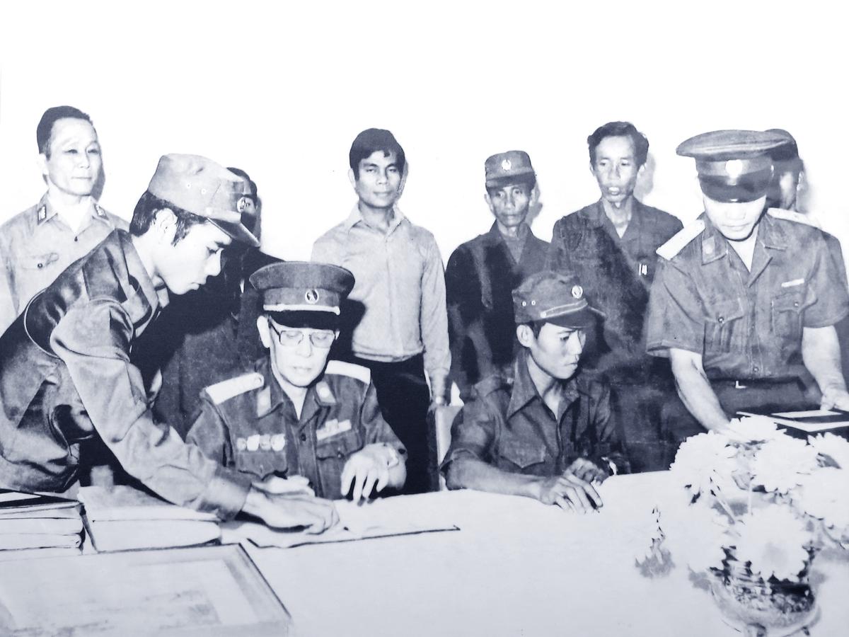 Đại tá Ngô Đức Thọ, Phó Tư lệnh Binh chủng và đại diện Bộ Tổng Tham mưu quân đội Campuchia kí kết văn bản bàn giao khí tài thông tin của Việt Nam cho trường Thông tin Campuchia, năm 1980