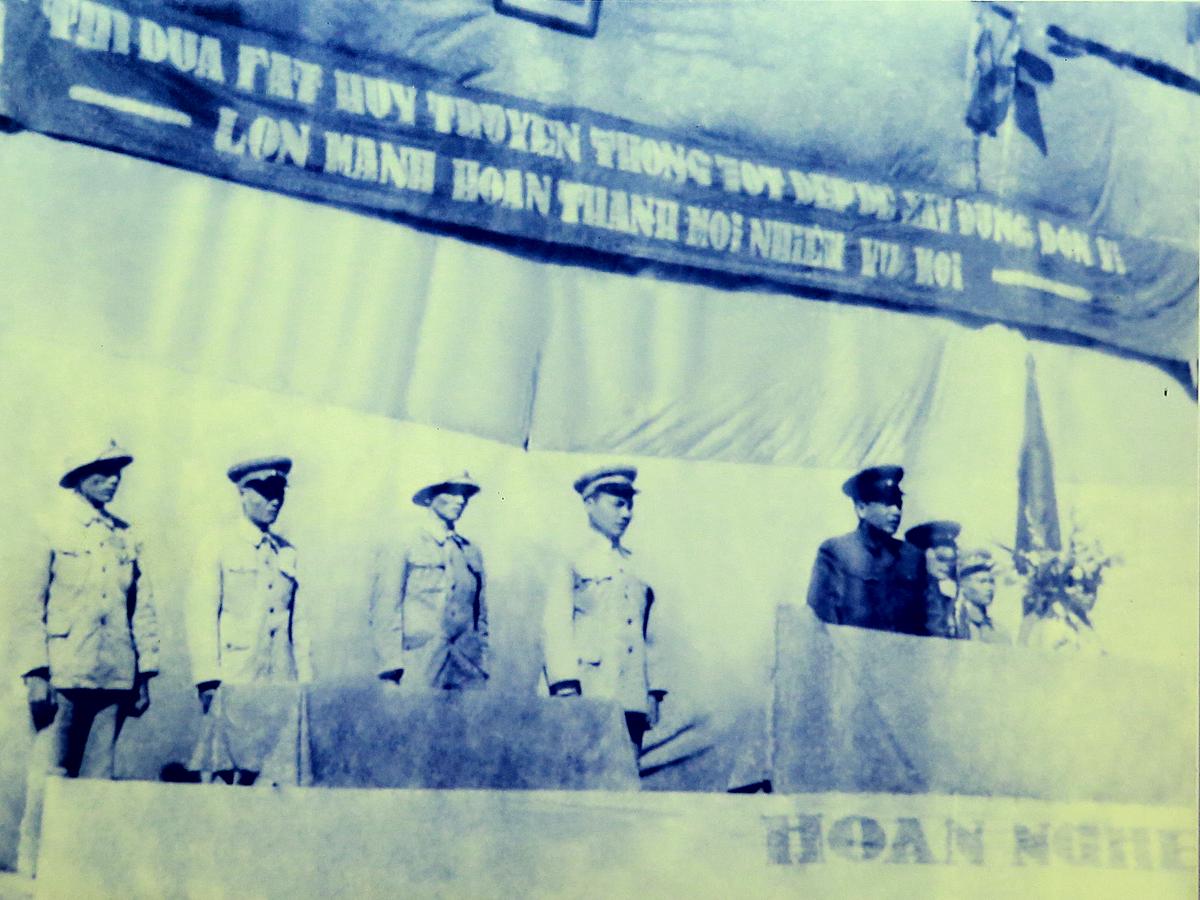 Đồng chí Văn Tiến Dũng, Tổng Tham mưu trưởng Quân đội nhân dân Việt Nam và đoàn Chủ tịch trong buổi lễ thành lập Trung đoàn 205 tại Bãi Bằng, Vĩnh Phú, ngày 23/10/1958