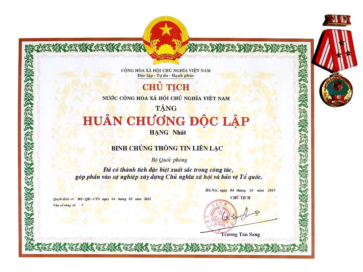Ngày 04/3/2015, Chủ tịch nước Cộng hòa xã hội chủ nghĩa Việt Nam Trương Tấn Sang ký tặng Binh chủng Thông tin liên lạc Huân chương Độc lập hạng Nhất.