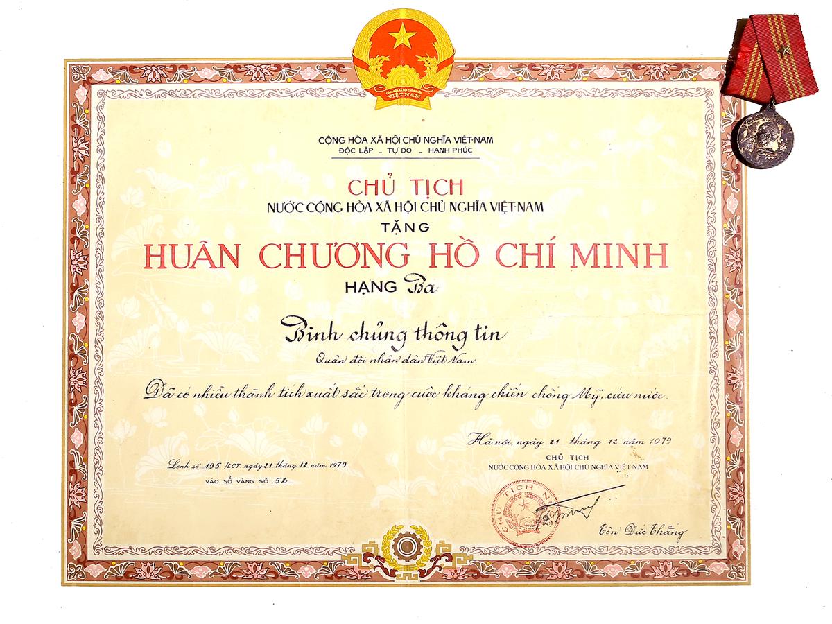 Với những thành tích đã đạt được, ngày 21/12/1979, Chủ tịch nước Tôn Đức Thắng đã ký Lệnh số 195, vào sổ Vàng số 52 tặng Huân chương Hồ Chí Minh hạng Ba cho Binh chủng Thông tin liên lạc.