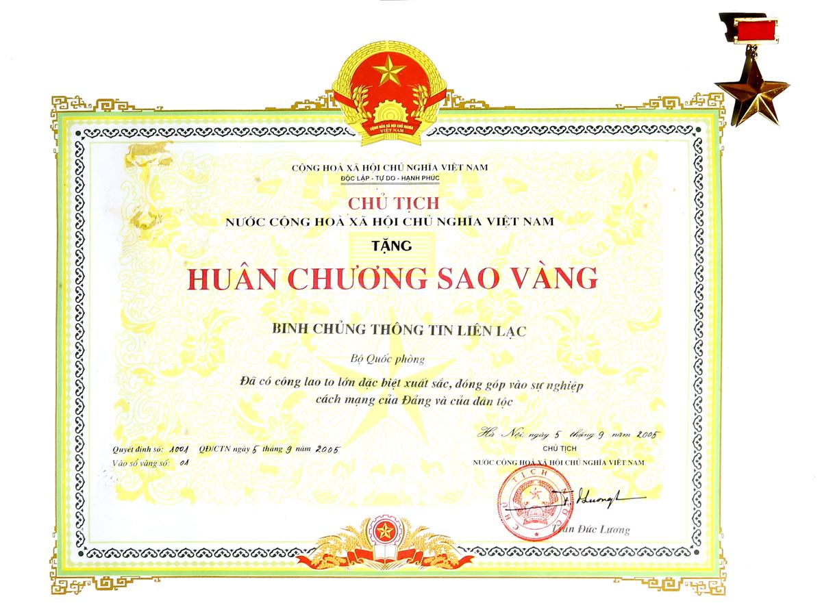 Ngày 05/9/2005, Chủ tịch nước Cộng hòa xã hội chủ nghĩa Việt Nam Trần Đức Lương ký Quyết định số: 1001 - QĐ/CTN tặng thưởng Huân chương Sao vàng cho Binh chủng Thông tin liên lạc thuộc Bộ Quốc phòng “Đã có công lao to lớn đặc biệt xuất sắc, đóng góp vào sự nghiệp cách mạng của Đảng và của dân tộc”.