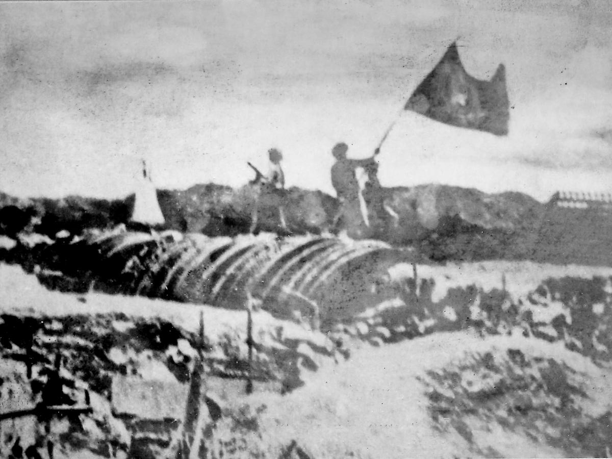 Lá cờ Quyết chiến quyết thắng trên nóc hầm Đờ - Cát, báo hiệu Chiến dịch Điện Biên Phủ thắng lợi, ngày 7/5/1954