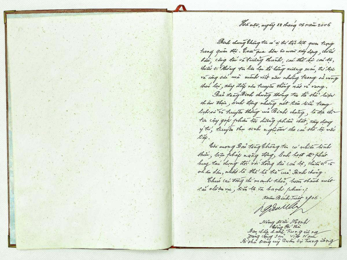 Sổ ghi cảm tưởng, đồng chí Nông Đức Mạnh, Tổng Bí thư Đảng Cộng sản Việt Nam ghi cảm tưởng nhân dịp đến thăm và chúc Tết Bộ đội Thông tin liên lạc, ngày 28/01/2006
