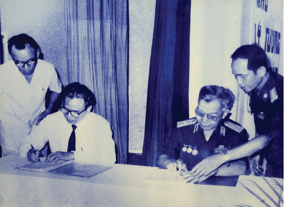 Các đồng chí đại diện cho ngành điện lực Việt Nam và Bộ Quốc phòng ký biên bản bàn giao 02 sợi cáp quang trên đường dây 500kV, ngày 08/8/1997