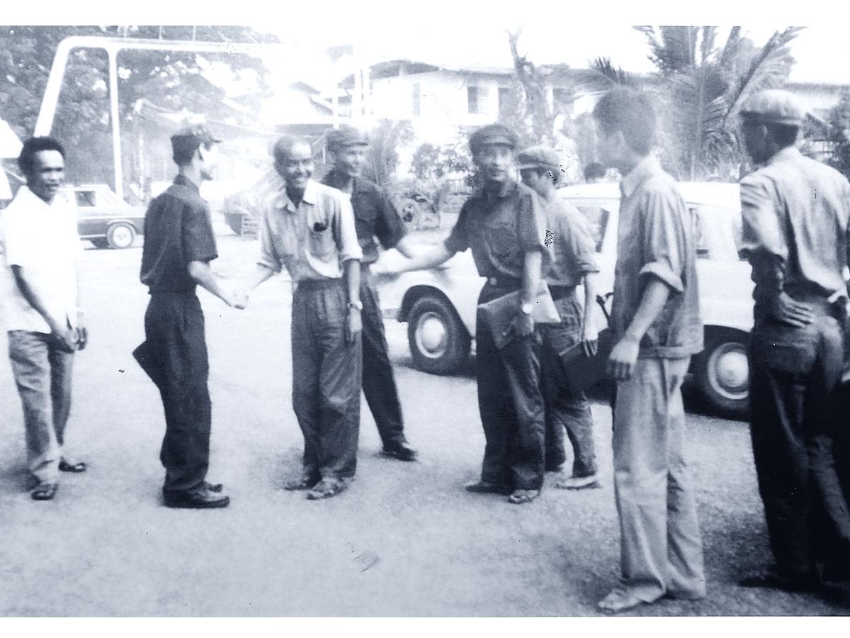 Trung tá Trần Ngọc Duyện, Chính ủy kiêm Hiệu trưởng Trường Kỹ thuật Thông tin Campuchia đón tiếp các đồng chí lãnh đạo Đảng nhân dân Cách mạng Bộ Quốc phòng quân đội Campuchia tới dự lễ khai giảng, năm 1979